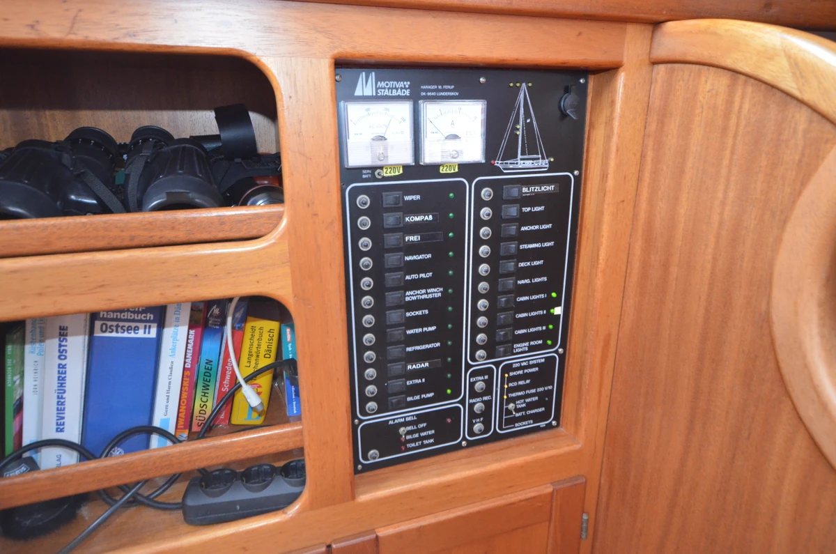 Elektro: 1 Ph. 230V Landstromanschluss, 3 x 140AH 12V Akkus Verbrauch (420 AH, neu 10/25), 1 x 140AH 12V Akku Starter (neu 06/24), Benzingenerator 230V 1 kw, Inverter 12V auf 230V 3 kw, in jedem Raum Steckdose 230V, teils mit 2x1,5 A 5V USB zum Laden von Mobilgeräten.