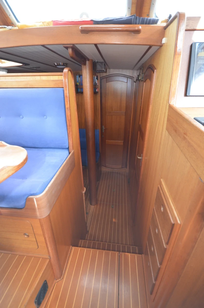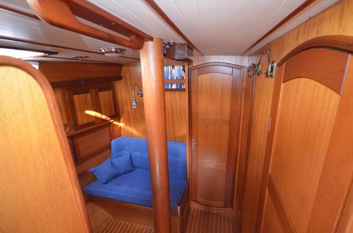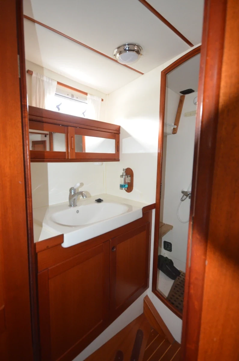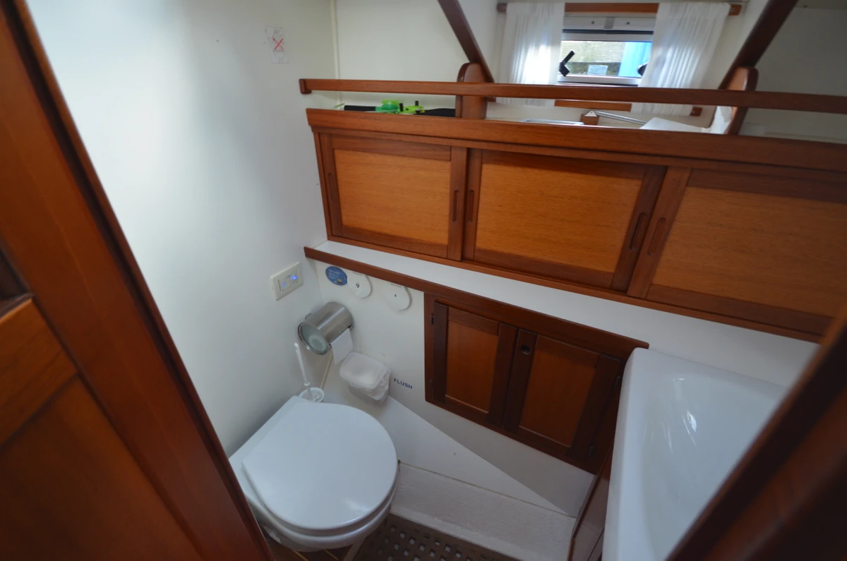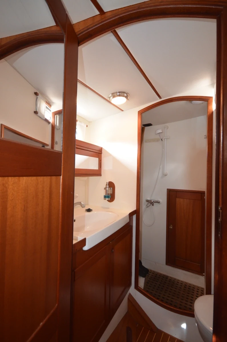 Nasszellen: 2 mit Waschtisch, Druckwasser, WC (Bug elektrisch, Heck manuell) und Dusche, achtern große separate Duschkabine mit Sitzmöglichkeit, Trockenmöglichkeit für Ölzeug, Schmutzwäschefach.
