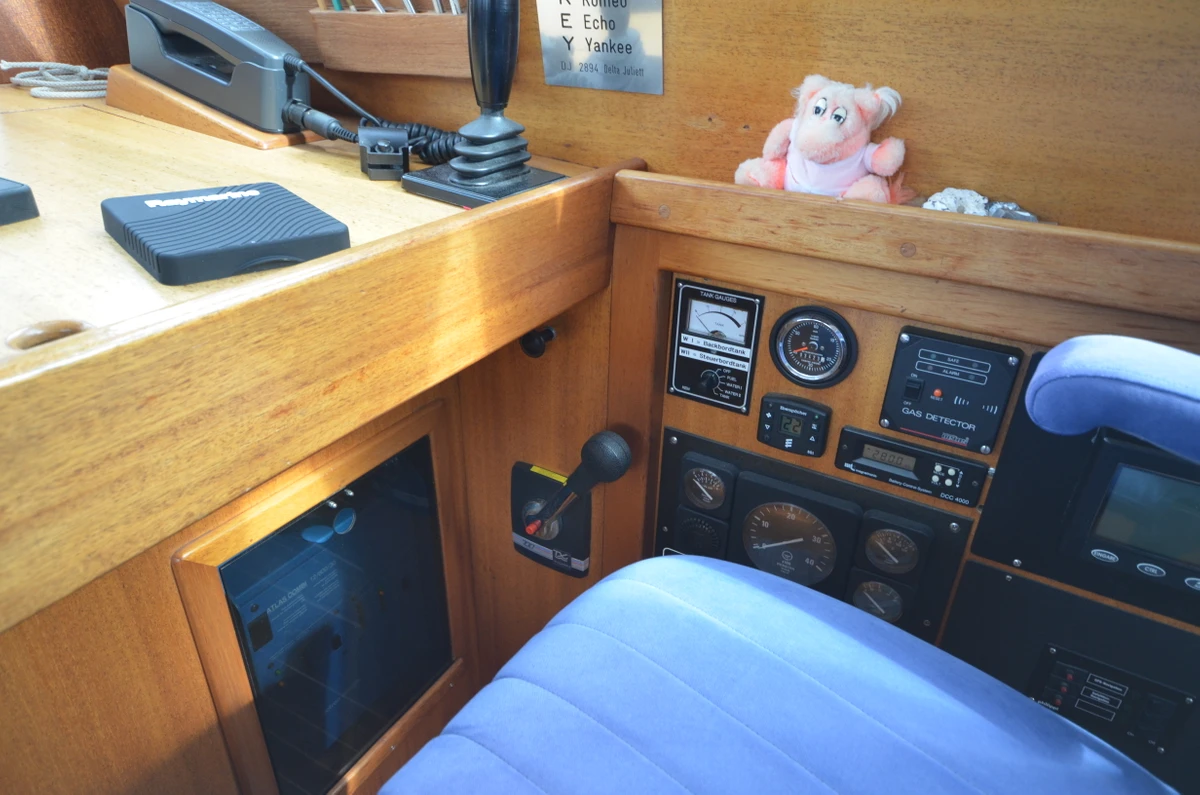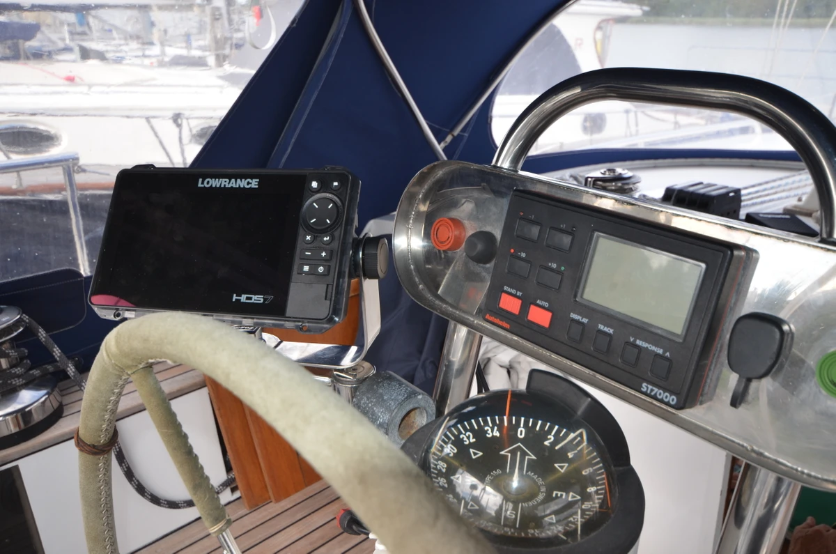 Autopilot ST7000 an der Steuersäule, mit Joystick am Innensteuerstand, Kabel-Fernbedienung