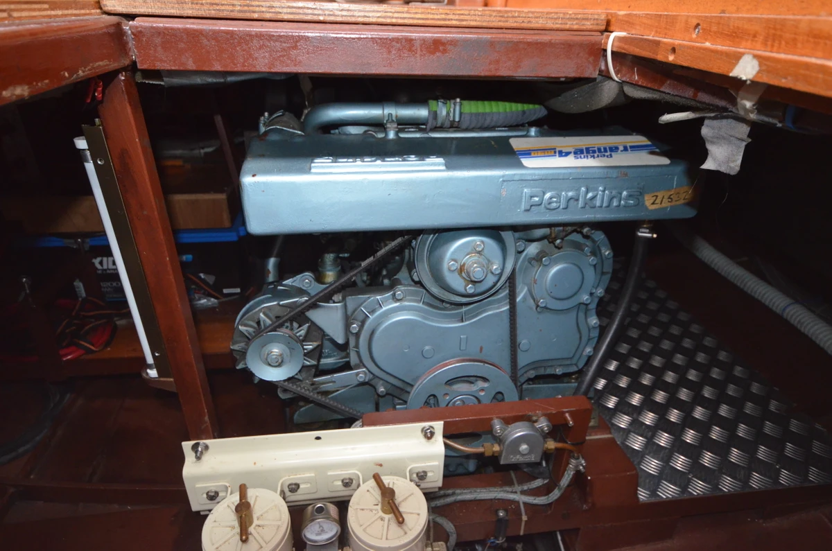 Motor/Getriebe/Welle: Perkins M90, 4 Zyl. Saugdiesel, 3,9 ltr. Hubraum, 84 PS, hydr. Wendegetriebe mit Welle und SPW Verstellpropeller, Verbrauch ca. 6 ltr./Std. bei 6,5 kn bei 1.700 1/min, V-max ca. 9 kt. bei 2.200 1/min.